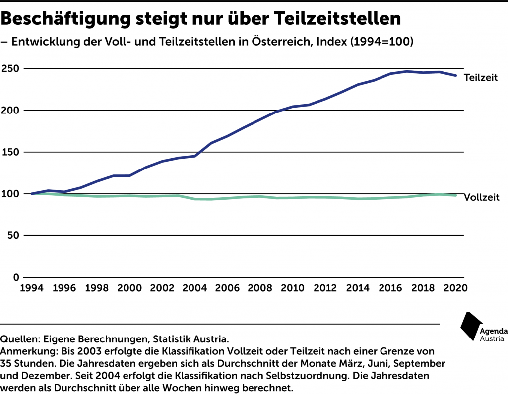 In Österreich herrscht derzeit Rekordbeschäftigung. Eine Berechnung der Agenda Austria zeigt aber: Der Anstieg der Beschäftigung ist seit den 1990er-Jahren fast ausschließlich auf den Anstieg der Teilzeitstellen zurückzuführen.