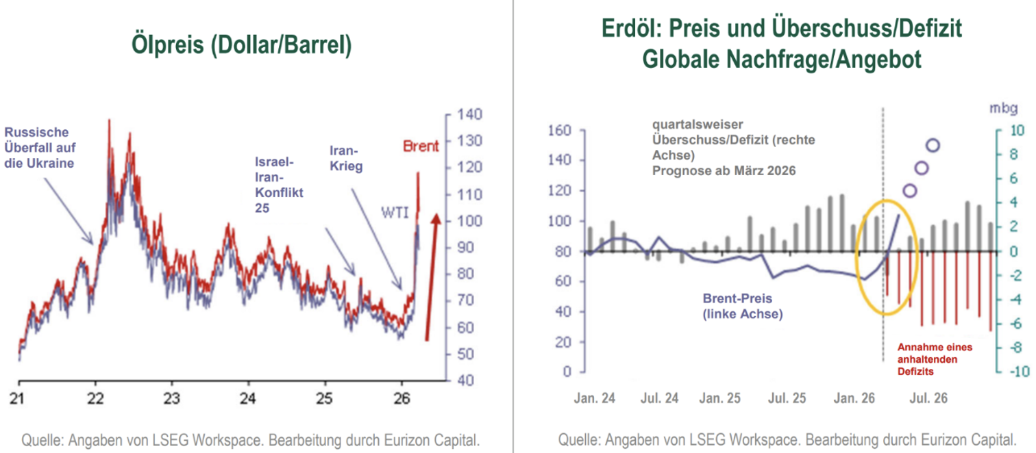 Der Ölpreis stieg rasch wieder auf über 100 US-Dollar pro Barrel, nachdem sich das Gleichgewicht zwischen Angebot und Nachfrage umgekehrt hatte. Während Anfang 2026 noch ein Überschuss von 2 bis 3 Mio. Barrel pro Tag erwartet worden war, gehen die Märkte inzwischen von einem Defizit von 4 bis 6 Mio. Barrel pro Tag aus.