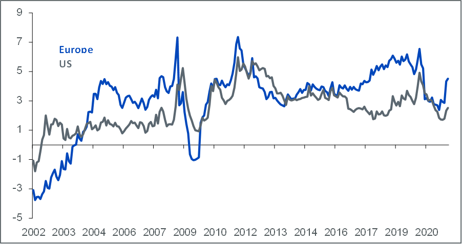 Die Aktienrisikoprämien die Differenz zwischen Gewinnen und Anleiherenditen sind in Europa auf ein 15-Monats-Hoch von 4,5 Prozent gestiegen. Dies deutet darauf hin, dass europäische Aktien im Vergleich zu Anleihen und anderen globalen Aktienmärkten attraktiv bleiben.