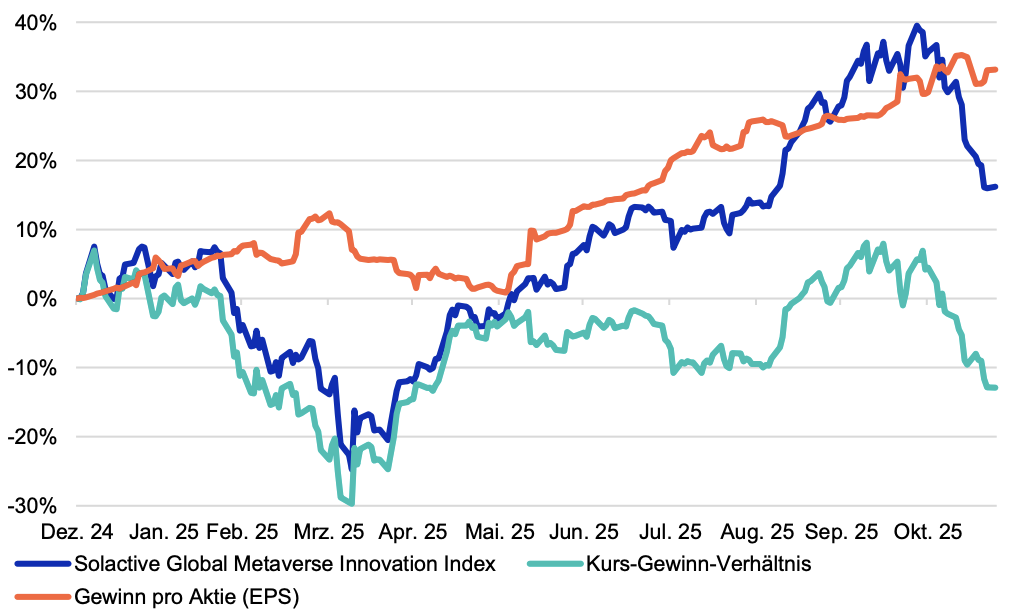 Das breitere KI-Ökosystem zeigt ein ähnliches Bild. Der Solactive Global Metaverse Innovation Index, ein grober Indikator für Engagement in KI und immersiven Technologien, ist in den vergangenen Wochen zweistellig zurückgegangen. Seit Jahresbeginn steigen jedoch die Gewinne des Index schneller als die Kurse. Der Gewinn pro Aktie (EPS) ist 2025 um mehr als 30 Prozent gestiegen, während der zugrunde liegende Aktienkorb um 16 Prozent zulegen konnte. Dies führte zu einem Rückgang der Bewertungen um fast 13 Prozent.