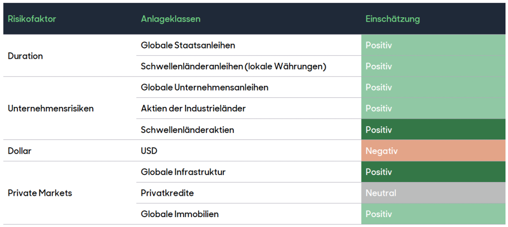 Wechseln wir zu Investmentchancen an den Finanzmärkten. Aberdeen sieht globale Staatsanleihen, Schwellenländeranleihen (lokale Währungen), globale Unternehmensanleihen Aktien der Industrieländer und globale Immobilien positiv. Wobei wichtig: Diese Schätzung wird „hellgrün“ hinterlegt (siehe Grafik), was eine gewisse Abschwächung signalisiert. Als „dunkelgrün“, werden Schwellenländeraktien und Infrastruktur global gekennzeichnet – was einen noch positiveren Ausblick bedeutet. Innerhalb des Aktienuniversums wurden neben China nochmals Small Caps als besonders erfolgsversprechend bezeichnet.