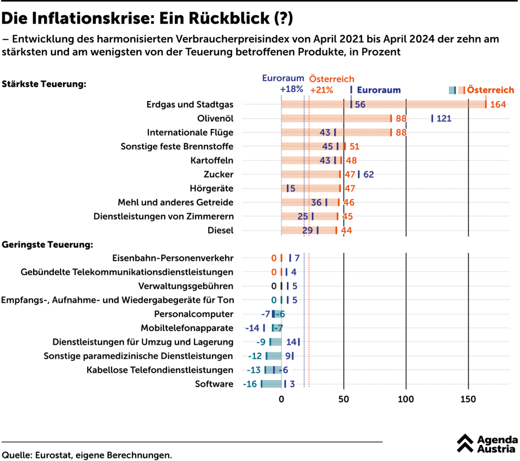 Dort sind die Preise im Mai gegenüber dem Vorjahresmonat um 3,8 Prozent gestiegen. Für Österreich ist das ein schwacher Trost, zumal sich die Inflation in den letzten drei Jahren gewaltig in die Haushaltskassen gefressen hat. Billiger geworden ist in diesem Zeitraum kaum etwas, wie eine Auswertung der Agenda Austria zeigt.