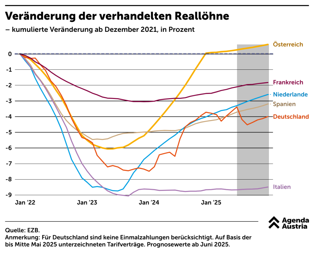 Das gelang trotz einer schrumpfenden Wirtschaftsleistung. Zwar sind auch in Österreich die Reallöhne zu Beginn der Inflationskrise gesunken. Das ist mit der Art der Lohfindung zu erklären. Die Inflation ist monatlich rasant angestiegen, während die Löhne nur jährlich angepasst werden. Daher musste die Bevölkerung im Jahr 2022 und 2023 tatsächlich Einkommensverluste hinnehmen.