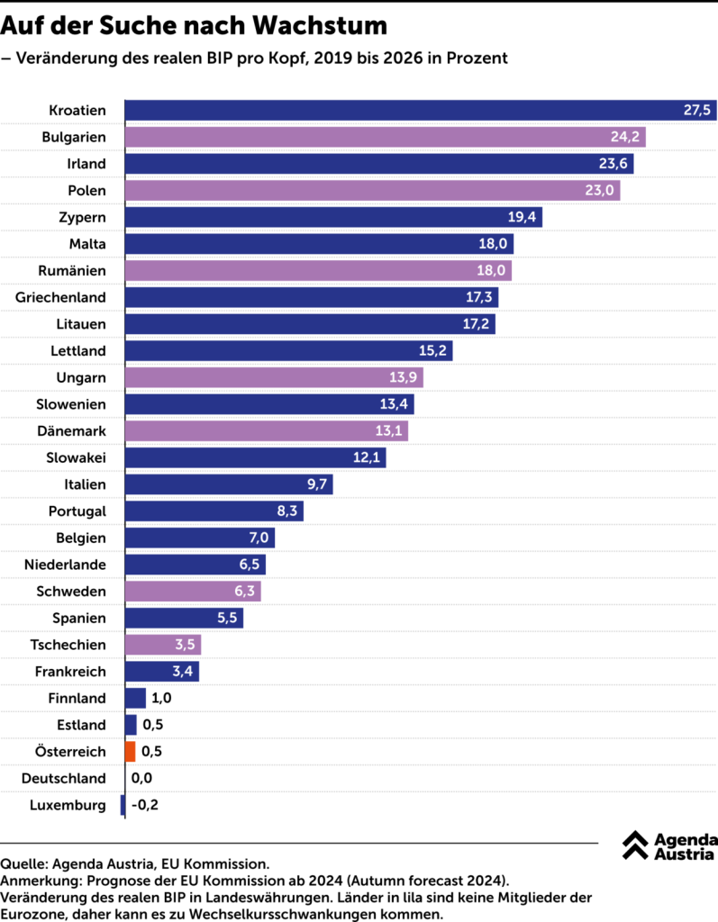 Während Spitzenreiter wie Kroatien, Bulgarien und Irland einen regelrechten Boom erwarten, liegt Österreich fast am Ende der Rangliste. „Überholt“ werden wir nur noch von Deutschland und Luxemburg. Damit gehört Österreich in dieser Beziehung weiterhin zu den schwächsten Volkswirtschaften in der EU, wie eine Auswertung der Agenda Austria zeigt.