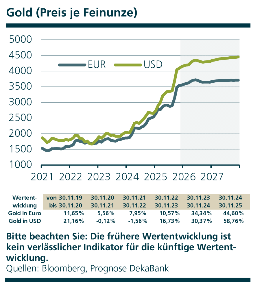 Neben Silber wirft die DekaBank auch einen ausführlichen Blick auf Gold: „Von der kurzzeitigen Korrektur Anfang November hat sich die Goldnotierung noch nicht vollständig, aber ein Stückweit erholt. Der Preis für eine Feinunze rutschte von seinem damals erreichten Rekordwert von gut 4.350 US-Dollar kurzzeitig auf unter 4.000 US-Dollar. Mehr als die Hälfte dieser Preiskorrektur wurde seitdem wieder aufgeholt. Zu der jüngsten Erholung dürften sowohl ein schwächerer US-Dollar als auch gestiegene Leitzinssenkungserwartungen der Marktteilnehmer an die US-Notenbank Fed beigetragen haben.