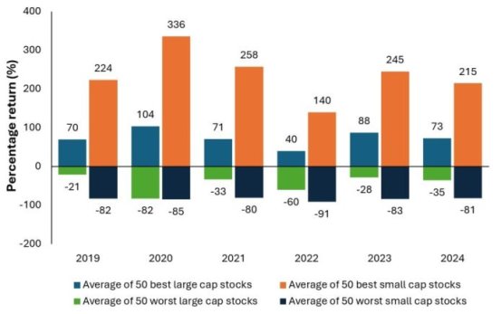 Im Gegensatz dazu weisen Large Caps tendenziell eine symmetrischere Renditeverteilung auf. Passive Investitionen in Large Caps – etwa über Indexfonds – erzielen Marktrenditen zu geringen Kosten und mit geringerer Volatilität. Allerdings ist das Aufwärtspotenzial dabei begrenzt. Und das Konzentrationsrisiko im Index kann es für aktive Manager potenziell schwieriger machen, ihre Benchmarks nach Abzug der Gebühren kontinuierlich zu übertreffen.